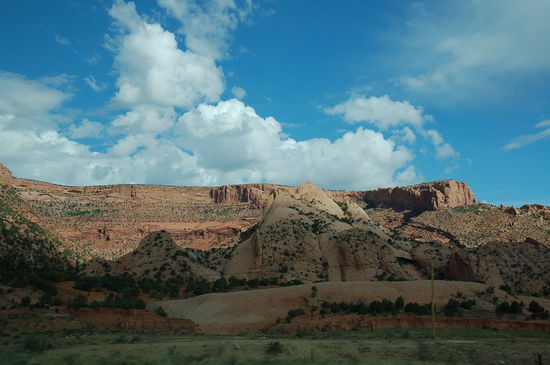 Nach ein paar Kilometern durch die rote Wüste, eingesäumt von den farbigen Tafelbergen, erreichen wir Kayenta und ein erster Kreis unserer Ferien schliesst sich. Wir wechseln auf den Highway 160 und fahren auf bekannten Wegen westwärts. Immer wieder erblicken wir höchst spannende Felsformationen. Eine kilometerlange Bergkette sieht aus wie sturmgepeitschte Wellen, andere Hügel erinnern an ledergegerbte Haut tausend Jahre alter Dinosaurier und dann stehen auf lang gezogenen Mesas einsame Gebirge, die an verzauberte Schlösser erinnern. Mit ein bisschen Fantasie kann man hunderte von Skulpturen in der grandiosen Berglandschaft erkennen.