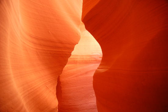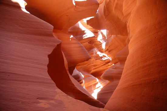 Doch bevor wir ans Wasser gelangen, wollen wir noch eine berühmte Laune der Natur besuchen: den Antelope Canyon. Dieser Canyon ist ein so genannter Slot Canyon. Dies ist die amerikanische Bezeichnung für eine enge, durch fliessendes Wasser geschaffene Schlucht. Es gibt den Lower und den Upper Antelope Canyon. Den einen Teil kann man nur mit einer geführten Tour besichtigen. Das Gebiet gehört den Diné, einem Navajo Stamm. Diese führen einem dann mit einem geländegängigen Wagen zum Einstieg des Upper Canyon und Führer schleusen die Leute durch die Schlucht. Die Besichtigungszeit ist begrenzt.