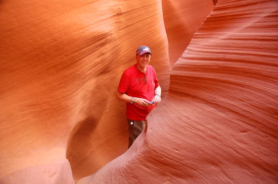 Die Sonne brennt erbarmungslos hinunter und wir sind froh, dass der Warteraum gedeckt ist. Um elf Uhr kommt ein junger Indianer mit Gitarre daher und führt uns zu einem schmalen Spalt in den roten Felsen. Die umliegenden Felsen sehen wunderschön aus: Tiefrot und wie Wellen eines Seeufers. Der Eingang des Antelope Canyons würde man ohne die Hilfe eines Kenners kaum finden. Wer käme schon auf die Idee in einen schmalen Spalt zwischen den roten Felsen zu klettern ohne zu wissen, was einem da unten erwartet. Jetzt verstehe ich auch, warum der Reiseführer von einem unbequemen Einstieg spricht. Ich muss mich wahrlich hindurchzwängen (gebe ja zu, dass schlankere, sportlichere Typen da sicher weniger Probleme hätten...). Meine Eleganz in dieser Hinsicht ist überwältigend und schon kämpfe ich mit den ersten Zweifeln, ob diese Tour wirklich eine gute Idee war! Doch die Klettertour wird einfacher als ich sehe, dass eine kleine Stahltreppe Hilfestellung bietet. So schafft es auch das unsportliche Fränzchen in die farbenfrohen Tiefen des Erdreichs. Und was uns da erwartet, verschlägt uns schlicht die Sprache: