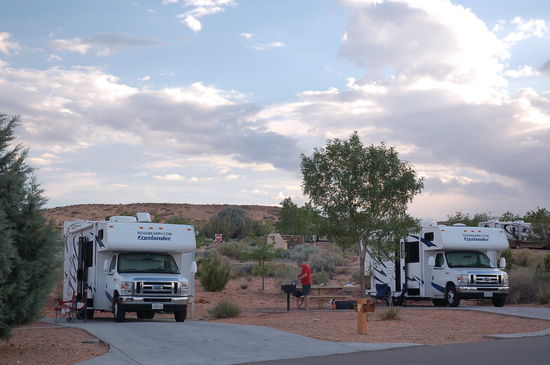 Doch zuerst checken wir mal im RV Resort ein und erhalten zwei tolle Standplätze mit Blick auf den See. An der Rezeption erkundigen wir uns nach dem Shuttle Bus Service. Morgen unternehmen Jürg und ich eine halbtätige Schiffsfahrt zur Rainbow Bridge. Der Bootshafen liegt ziemlich entfernt vom RV Park und wir möchten eigentlich nicht unseren Camper "abprotze" nur für diesen Ausflug. Die Dame meint, dies sei kein Problem. Der Shuttle Service starte um 8 Uhr. Finden wir toll ... vorallem weil unsere Tour um 7.30 h los geht! Und so entnerve ich mich mal kurz über diese Tatsache. Denn die Schiffstour startet ja jeden Tag und wir sind sicher nicht die einzigen Touristen im Jahr, die dort daran teilnehmen. Was für ein doofer Service! Die Dame telefoniert darauf mal kurz mit der Lodge und die meinen grosszügig, man könne uns ausnahmsweise um 7 Uhr abholen. Dankeschön...