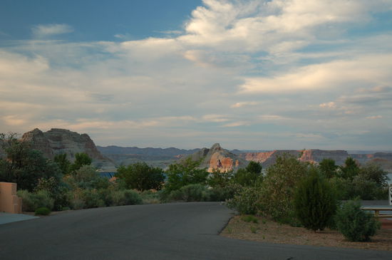 Wieder einmal stellen wir unsere Campers. Die Plätze liegen wunderschön erhöht über dem See und wir haben einen prächtigen Blick in die umliegenden Berge. Die wüstenhafte Vegetation auf dem RV Park ist herrlich trocken, wird aber durch viele grüne Büschen und Bäumen optisch aufgelockert. Die Berge, die den Lake Powell einrahmen, sind höchst farbenfroh. Doch beim genauen Hinsehen erkennt man, dass der See tief unter seinem Höchststand ist, was uns ja schon beim Lake Mead aufgefallen ist.