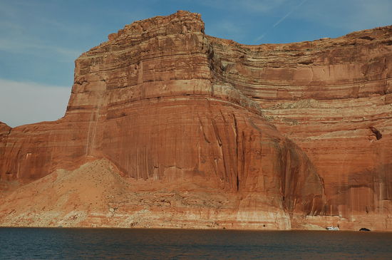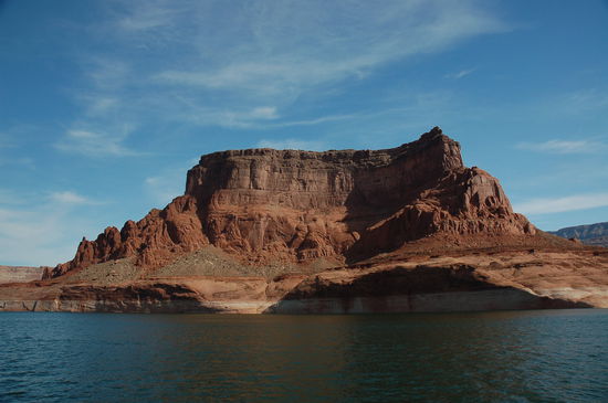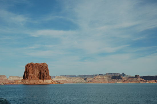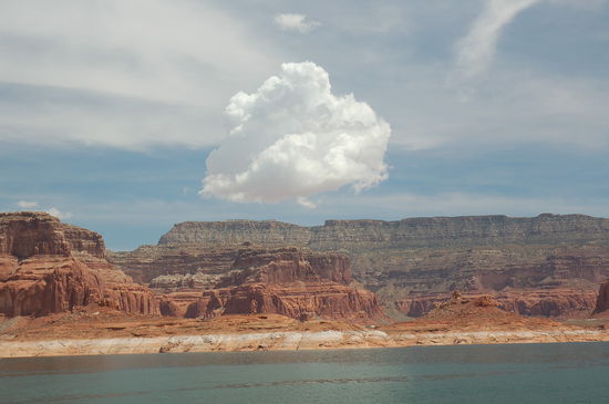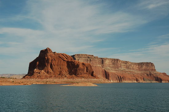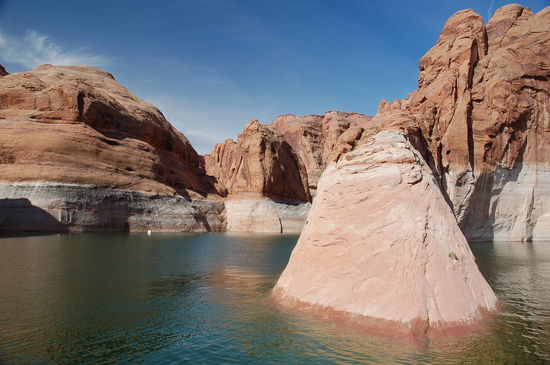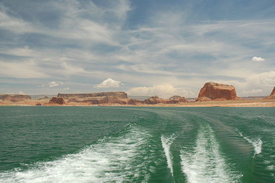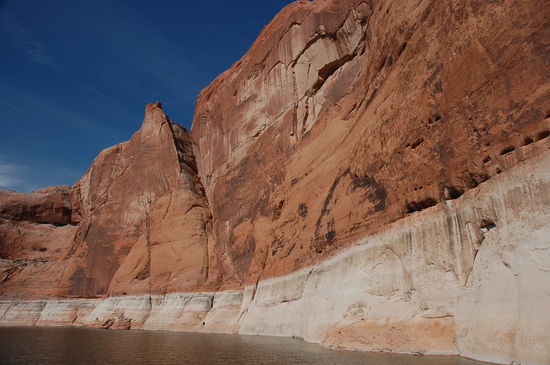 Sonne, Wind und Regen formen auch hier eine höchst malerische Landschaft aus verschiedenen Sandsteinschichten. Immer wieder verzweigt der See in enge und geheimnisvolle Canyons ab, dank dem tiefen Wasserstand entstehen Sandbänke, die vorallem Hausboote zum Andocken und Verweilen verleiten. Die Reise in die Märchenwelt der roten Felsen ist unglaublich schön und natürlich verleitet die Fantasie zu vielen unausgesprochenen Geschichten über geheimnisvolle Burgen, Höhlen und Gestalten, die hier in Einsamkeit leben könnten. Oftmals erblicken wir Adler, die in gewaltiger Höhe ihre Kreise über dem See ziehen. Es ist märchenhaft.
