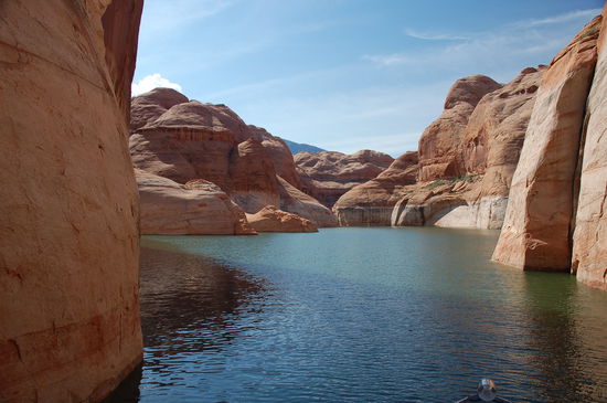 Die Schlucht wird immer enger. Von nahem wirken die Felsen sehr interessant, überall erblicken wir schöne Strukturen im Sandstein, aber auch verborgene Bögen und Höhlen. Und plötzlich wird es ganz kritisch! Das Schiff fährt auf einen Taleinschnitt zu, der kaum so breit ist wie das Schiff selber. Wir rücken alle zusammen und staunen, dass wir knapp durchkommen ohne die Felswände zu berühren. Danach öffnet sich das Tal wieder ein wenig und wir erreichen einen kleinen See umrahmt von tiefroten Sandsteinklippen. Dort befindet sich ein kleiner Hafen, wo das Schiff anlegt. Über Lautsprecher erhalten wir Anweisungen: wie lange wir hier ankern, dass es ein kurzer Marsch zur Rainbow Bridge sei und dass wir unbedingt genügend Wasser mitnehmen sollen, da es im Tal unglaublich heiss sei.
