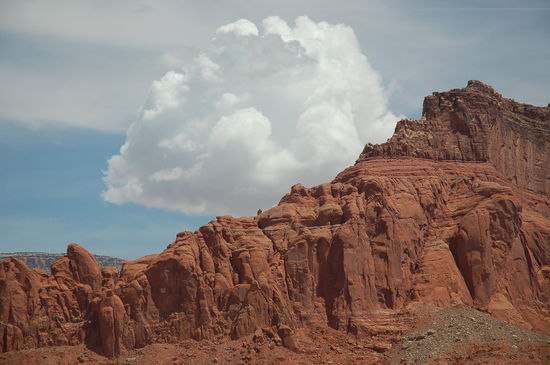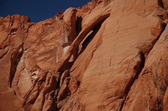 Bereits 1990 waren wir mit Märi und Beat hier. Damals war der Wasserstand weitaus höher und unser Schiff konnte viel weiter ins Tal hinein fahren. Wir verlassen das Boot und per Pedes geht es über den langen Steg aufs Festland. Wir umlaufen eine breite Klippe und erblicken einen kleinen Teil des berühmtesten Steinbogens der USA, der Rainbow Bridge.