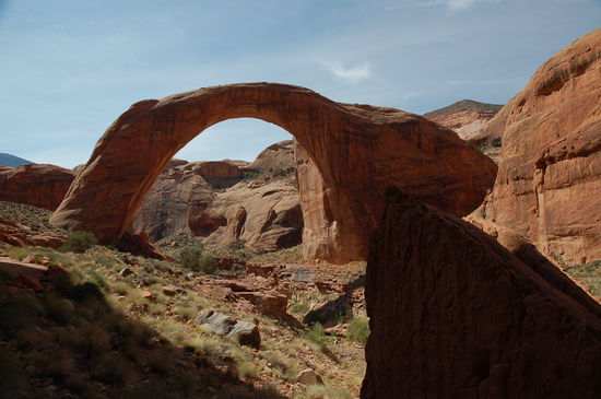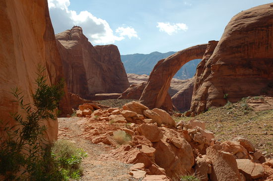Der Weg führt am Rande der Berge entlang. Der Schatten ist höchst angenehm. Und die Rainbow Bridge schiebt sich immer mehr in unser Blickfeld bis wir die Brücke in ihrer ganzen eindrücklichen Grösse vor uns haben. Es ist unglaublich! Und dann stehen wir davor: vor der höchsten natürlichen Steinbrücke der Welt mit einer Höhe von beachtlichen 88 Metern und einer Spannweite von 82 Metern. Der Anblick ist höchst beeindruckend!