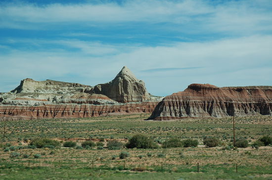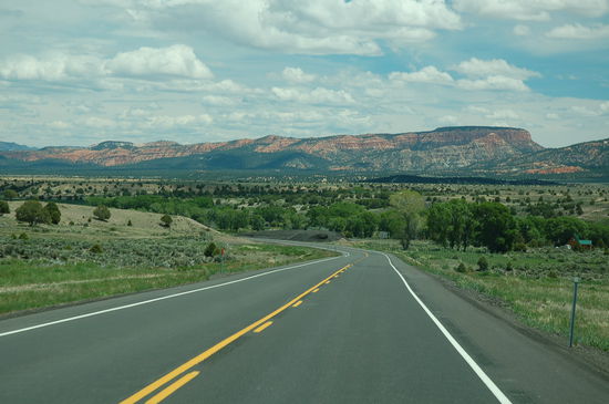 So geht unsere Bergtour los und wir verlassen den schönen Lake Powell. Der letzte Blick fällt auf den eindrücklichen Glen Canyon Dam, dann geht's auf dem Highway 89 westwärts. Das Gebiet, das wir durchfahren, ist höchst malerisch. Tafelberge mit unterschiedlichsten Steinschichten begleiten uns linker- und rechterhand. Es ist eine Reise in die Vergangenheit des Colorado Hochplateaus. Jede unterschiedlich farbige Steinschicht erzählt eine Geschichte wie das Plateau entstand und wie es durch Wasser wieder verändert wurde. Die Farben sind grandios und leuchten uns eindrücklich entgegen. Kurvig führt uns der Highway auf Höhen mit herrlicher Aussicht und wieder hinunter in grüne oder wüstenhafte Täler mit trockenen Flussläufen. Zurecht wird der Highway "scenic route" genannt.