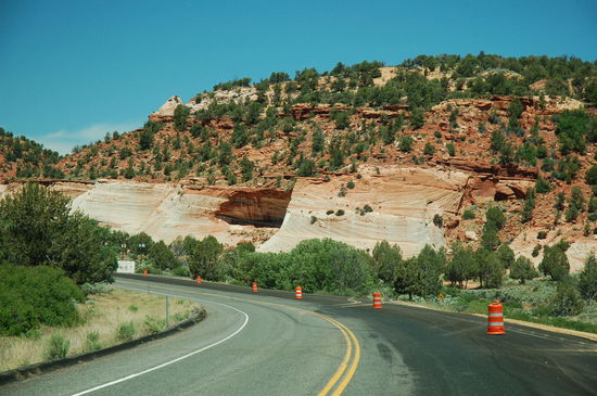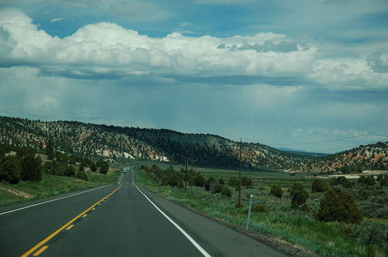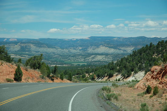 Unsere Fahrt geht weiter. Die wüstenhafte Vegetation ist immer seltener zu sehen, die Täler werden immer fruchtbarer, das Gras grüner und Flüsse begleiten unseren Weg. Es ist wunderschön! In Mount Carmel Junction fahren wir in die Berge hinein. Langsam steigt der Highway nun an und unsere Fahrzeuge brauchen mehr Kraft um die Steigungen zu bewältigen. Die lang gezogenen Täler, die wir durchfahren, sind idyllisch schön. Überall erblicken wir grössere und kleinere Farmen mit Kuhherden oder Pferden, die auf den saftigen Wiesen weiden. Die umliegenden Berge werden ab und zu von tiefroten Felsformationen unterbrochen, die eindrücklich hervor leuchten. Es ist ein schönes Gebiet, das wir durchfahren, und wir verstehen die Mormonen, die hier ihr Paradies gefunden haben!