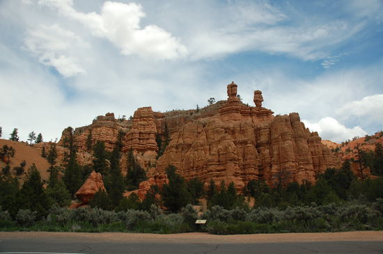 Nach Hillsdale wechseln wir auf den Highway 12, der uns ostwärts zum Bryce Canyon bringt. Wir erreichen den Dixie National Forest, wo uns ein Augenschmaus erwartet: der Red Canyon. Unvermittelt fährt man durch eine purpurrote Welt bestehend aus höchst interessanten Felsformationen. Die Farbe erhalten die Felsen von Eisenoxid. Aufgelockert werden die tiefroten Felsen von Ponderosa Pines oder auf gut Deutsch Gelbkiefern. Zwei spektakuläre Tunnels führen mitten durch die roten Felsen hindurch. Sind in gewissen Gebieten märchenhafte Felsen und Türme zu sehen, ändert das Gebiet in sanfte rote Hügelzüge und dann sind wir auf dem Paunsaugunt Plateau, wo sich der grosse Bruder des Red Canyon befindet, der Bryce Canyon.