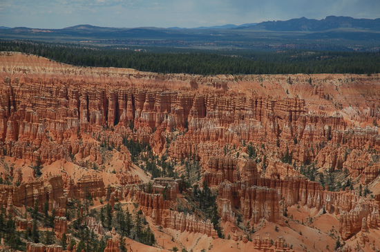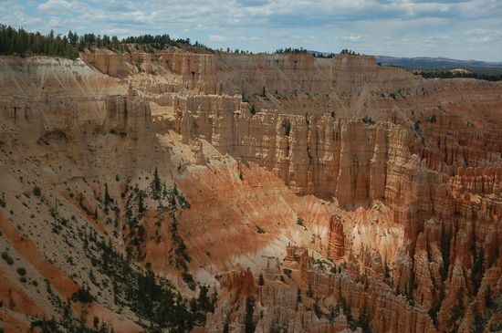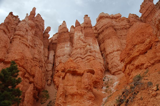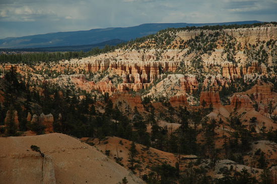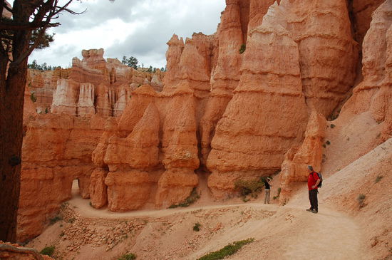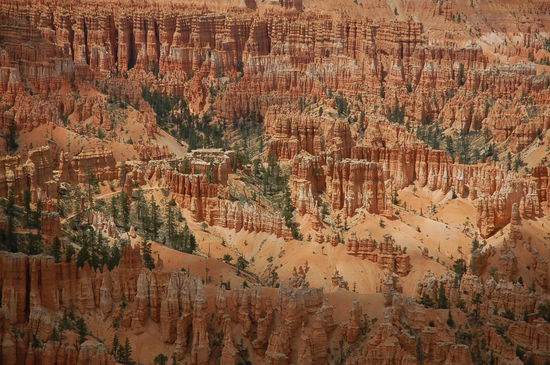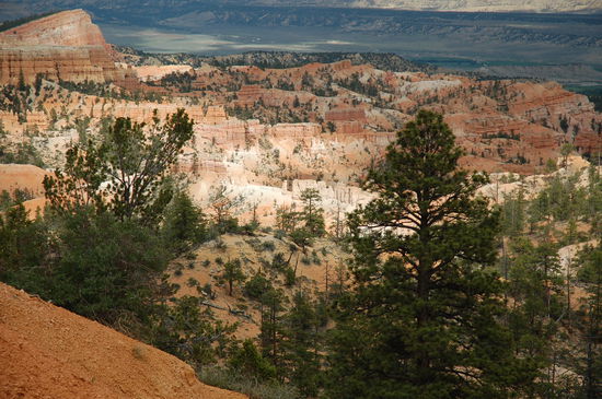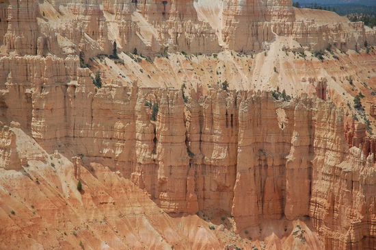 Und davor stehen wir nun, natürlich noch mit vielen anderen Bewunderern. Die Farben sind überwältigend, von weiss zu rosa, von orange zu rot und gelb und dazwischen die grünen Kiefern. Die Strukturen der Türme sind unglaublich präzise und wechseln ihre Farbe alle paar Meter. Lange stehen wir da und geniessen den Ausblick inklusvie Sonnen- und Schattenspiel. Doch will man den Park mit jeder Faser seines Körpers erleben, muss man in die Märchenwelt hinabsteigen. Und das werden wir auch tun.