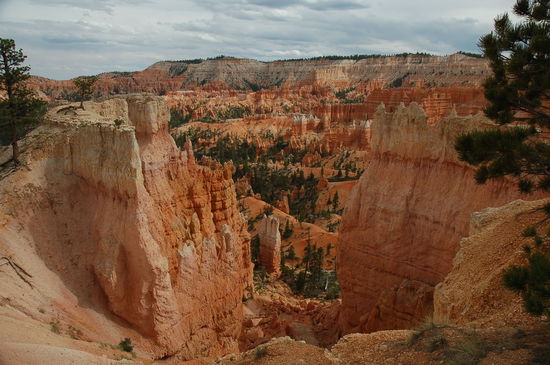 Knapp ergattern wir uns am Bryce Point einen Parkplatz und spazieren zum gesicherten Abgrund. Der Anblick ist grandios! Zu unseren Füssen breitet sich eine Märchenwelt bestehend aus farbenfrohen Mauern, Türmen, Schlösser, Brücken und Märchengestalten aus. Es ist kaum zu glauben. Das Spiel der Sonne mit den Wolken zaubert ein unglaubliches Schattenspiel darauf. Die Luft ist rein und wie bei uns an einem Föhntag, erblicken wir die Zauberwelt in einer unglaublichen Klarheit. Postkartenwetter!