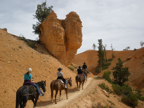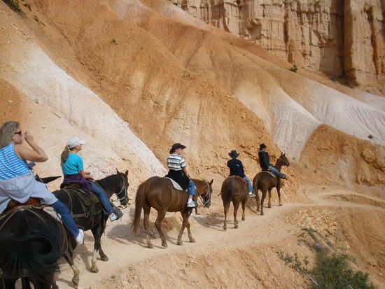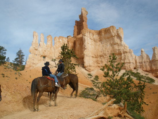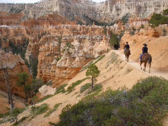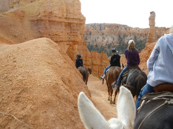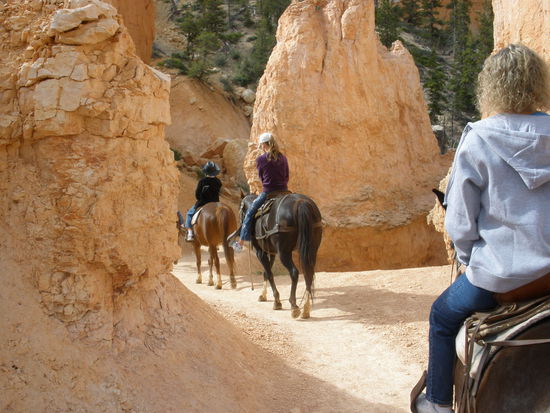 Nach anderthalb Stunden erreichen wir unser Ziel, einen Corrall tief unten im Canyon. Dort gibt es etwas zu trinken und ganz wichtig - es hat Toiletten! Nach einer halben Stunde geht der Reitausflug zurück. Da es sich um einen Loop handelt, geht der Weg zurück auf anderen Pfaden. Ab und zu wird es wirklich dramatisch. Da reiten wir auf schmalen kurvigen Pfaden hinauf auf einen Bergrücken um dann auf der anderen Seite steil wieder hinunter zu reiten. Ab und zu darf man wirklich kaum hinunterschauen. Doch die Pferde und Mulis sind sehr trittsicher und kennen ihren Job! Ruhig bringen sie uns von einer landschaftlichen Schönheit zur anderen. Es ist ein wunderbarer Ausflug und noch einmal eine andere - höchst reizvolle - Möglichkeit den Bryce Canyon zu erleben!
