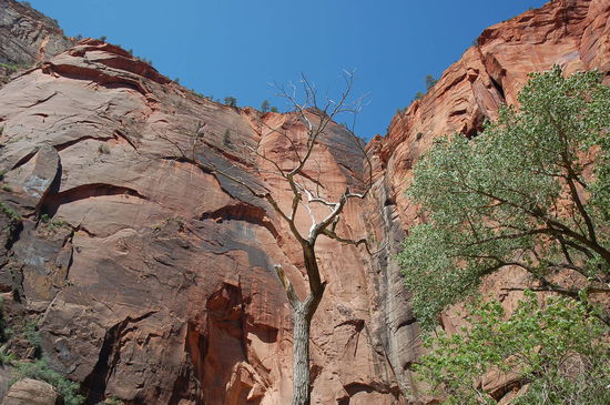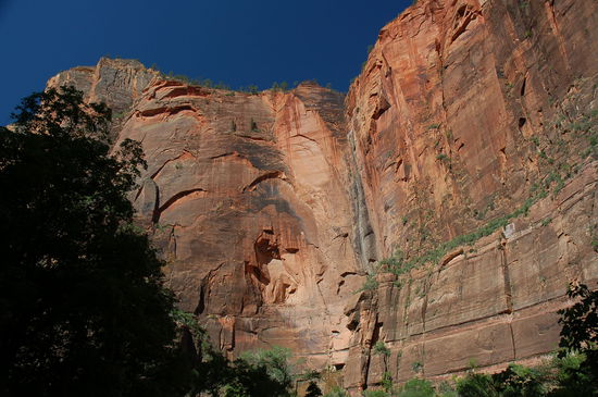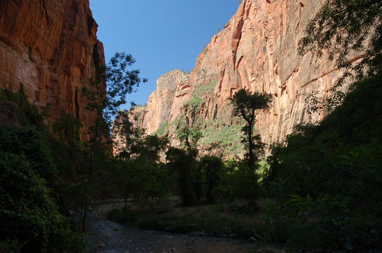 Wir fahren bis zur letzten Haltestelle, zum Temple of Sinawava. Dort geht es per pedes weiter in ein enges Tal hinein. Linkerhand fliesst der Virgin River und rundherum scheinen uns hohe Felswände zu erdrücken. Wir wandern tief im Schatten des erwachenden Morgen.