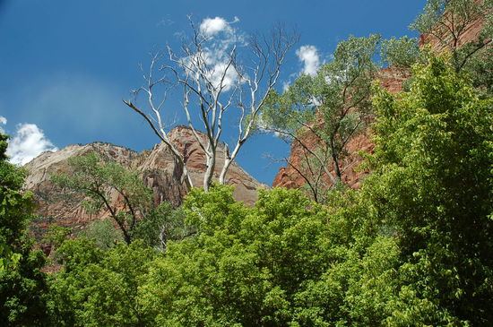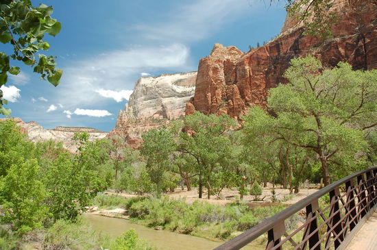 Dort ist schlicht die Hölle los. Es ist ein Treffpunkt für alle und die einzige Möglichkeit sich zu verpflegen. So sitzen viele Leute gemütlich in den Restaurants und dazugehörigen Terrassen oder picknicken auf der grossen Wiese unter riesigen Bäumen. Wir wollen noch zu den Emerald Pools. Eine Brücke führt uns über den Virgin River. Die Mittagssonne lässt die herrliche Umgebung völlig unwirklich erscheinen. Die Farben wirken wie unter gleissendem Flutlicht. Das Rot, Weiss, Orange und Braun der umliegenden Berge, dann das lindengrün der Bäume im Tal, der smaragdgrüne Virgin River und darüber der tiefblaue Himmel mit den aufkommenden schneeweißen Kuschelwolken. Man fühlt sich wie in einer gemalten Kulisse gefangen. Einfach nur schön...