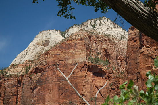 Jürg und ich wollen uns auch noch sportlich betätigen, aber im kleineren Rahmen. Zuerst steigen wir bei der Haltestelle Big Bend aus um festzustellen, dass es außer der Hauptstrasse keinen eigentlichen Wanderweg gibt. Also nehmen wir wieder den nächsten Shuttlebus und lassen uns zum "Grotto" fahren und wandern bis zur Zion Lodge.