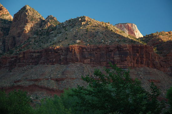 Jürg und ich sitzen im morgendlichen Schatten und bewachen Evas und Mäthus Gepäck. Als es mir zu langweilig wird, spaziere ich gemütlich wieder den Wanderweg zurück. Die Sonne erobert immer mehr vom malerischen Tal und entsprechend schöne Bilder warten um eingefangen zu werden. Lange sitze ich am Virgin River und geniesse das Rauschen des Wassers und den wärmenden Sonnenschein.