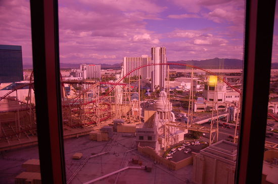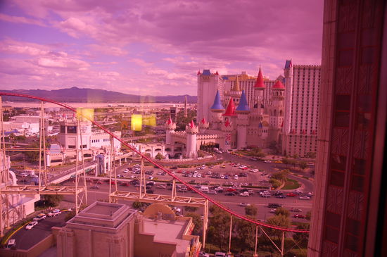 Endlich erhalten wir unsere Zimmernummer. Wie Mäthu und Eva sind wir im 15. Stock. Zuerst holen wir bei den Beiden unser Gepäck, dann geht's ins schöne Zimmer. Die Stimmung ist wirklich lustig. Die Scheiben sind knallrot und damit erscheint das Zimmer in einem ziemlich schrägen Licht. Ausblick haben wir auf den Strip und das mittelalterliche Excalibur Casino. Uns gefällt's!
