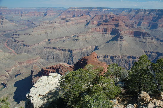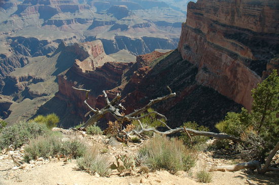 Die Wanderung geht weiter und führt uns in immer wieder neue Schluchten mit immer wieder spektakuläreren Ausblicken. Plötzlich erblicken wir unter uns das Grand Canyon Village und darunter den Bright Angel Trail. Es ist einer der wenigen Trails, die in den Canyon hinabführen. Eva und ich lernten ihn 1995 kennen als wir eine Tagestour mit Mulis unternahmen. Es war etwas vom Schönsten, das wir je sahen ... und etwas vom Schmerzhaftesten! Nach 7 ½ Stunden auf dem Rücken eines Mulis lernten wir Knochen kennen, von denen wir keine Ahnung hatten...