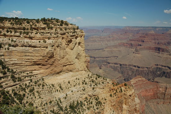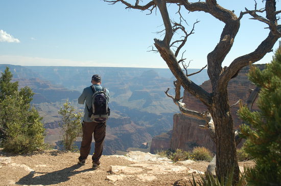 Der Rim Trail führt uns weiter ostwärts zum Powell Point, wo sich ein Denkmal von John Wesley Powell befindet. Etwas später erreichen wir den Maricopa Point, Ein dünne Felsnase führt uns noch mehr über den Abgrund und der Anblick der in die Tiefe fallenden Felswände ist mehr als atemberaubend.
