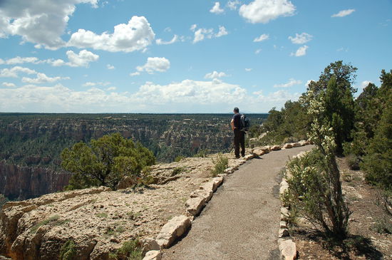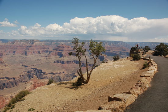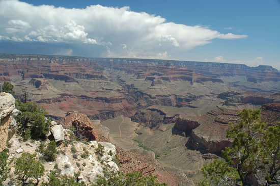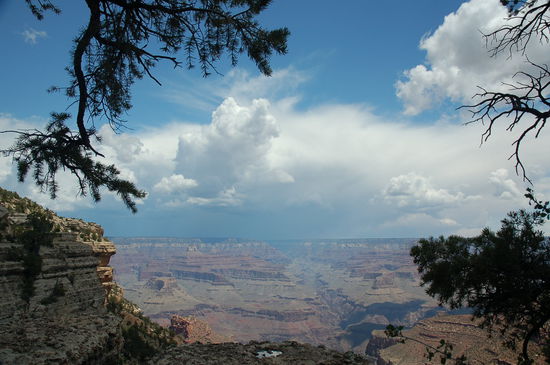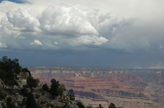 Je näher wir uns dem Grand Canyon Village nähern, desto mehr Leute hat es. Die schönen ruhigen Stunden am Rim scheinen vorbei zu sein. Gegen Mittag erreichen wir das Village. Die dreistündige Wanderung war wahrlich ein Traum. Am Nordrand und teilweise auch über dem Canyon bilden sich schwarze Wolken und ab und zu schiessen Blitze in die Tiefe. Es ist ein spektakuläres Wetterschauspiel!