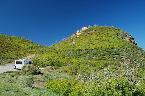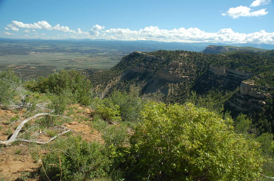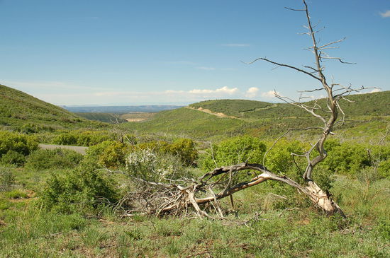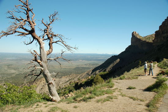 Kurvig verlassen wir den Morefield Campground und gelangen schnell auf eine der Bergrücken hinauf. Unseren ersten Halt machen wir beim Montezuma Valley Overlook, wo wir einen herrlichen Blick hinunter in die Ebene von Cortez haben. Weiter geht's zum Park Point Overlook und Geologic Overlook. Immer wieder erfreuen wir uns an den schönen Ausblicken, sei es über das Plateau des Mesa Verde, in Richtung der Rockies oder hinunter in die riesige Ebene. Viele Geisterbäume, die ihre Äste grau und klagend gegen den Himmel recken, zeugen von vergangenen Feuern.