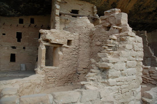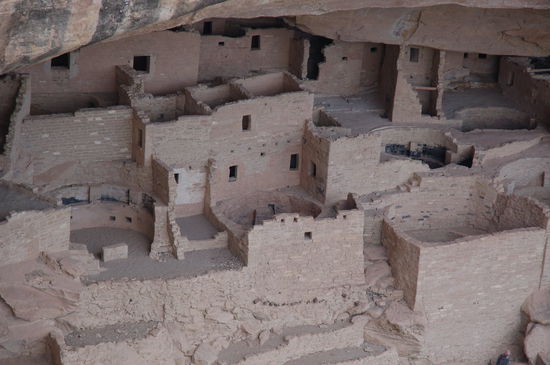 Die weitere Fahrt über die Panoramastrasse führt uns zum berühmten Spruce Tree House. Es ist die drittgrösste Siedlung von Felsenwohnungen, die hier im Mesa Verde gefunden wurde. Erbaut wurde sie zwischen 1200 - 1276 von den Anasazi. Das ganze Dorf bestand aus imposanten 114 Wohnungen und 8 Kivas (Zeremonienräume). Das ganze wurde unter einen riesigen Felsvorsprung von beachtlichen 66 Metern Breite und 27 Meter Tiefe gebaut. Man geht davon aus, dass bis zu 100 Menschen hier lebten.