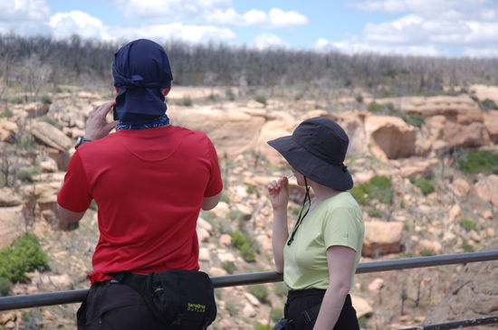 Eine lange Treppe führt uns zum Aussichtspunkt von Cliff Palace. Es ist wirklich eine eindrückliche Ansammlung von Steinhäusern und überall stehen Gruppen von Touristen mit einem Ranger herum und hören den Ausführungen zu. Cliff Palace darf nur mit Rangern auf geführten Touren betreten werden. Das aber wollten wir nicht. Es sieht ziemlich anstrengend aus dort hinunter zu klettern und noch schöner: wieder hinauf. Das bei der Hitze - nö, nichts für uns. So geniessen wir halt nur den Ausblick auf das schöne Tal und den Felsenwohnungen.