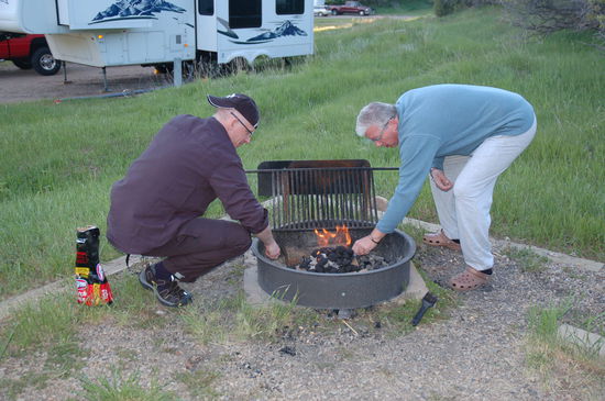 Am Abend grillieren wir gemeinsam bei unserem Camper. Bei Eva und Mäthu gibt es Lachs und Kartoffeln, bei uns Poulet und Salat. Es wird ein schöner Abend. Alle Gewitterwolken sind verschwunden, der Sonnenuntergang ist anbetungswürdig. Es wird aber auch schnell kalt. Auf den einzelnen Campingplätzen gibt es regen Wechsel. Ein jüngeres Ehepaar mit Kleinkind fährt vis-à-vis auf den Platz mit einem sehr kleinen America Cruise Camper. Während Mama kocht, spielt Papa draussen mit dem Kleinen, welcher riesigen Spass im Gras hat.