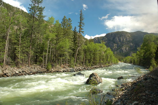 Ein Blick zum Fenster hinaus zeigt uns wiederum einen strahlend schönen Morgen. Die Sonne geht grad über den Bergen hinter dem Fluss auf und glitzert im Wasser wie tausend Diamanten. Es ist wunderschön!
