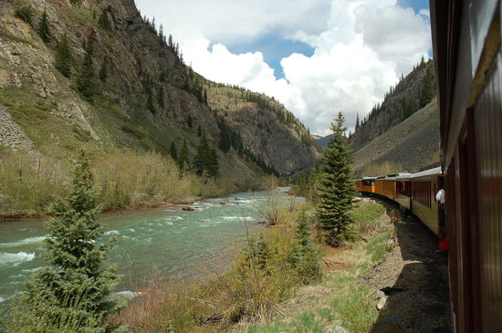 Nach einer Stunde erreichen wir bereits einer der Höhepunkte der Strecke, die Schlucht des Animas Rivers. Langsam windet sich der Zug in Schwindel erregender Höhe den Berghängen entlang und zu unseren Füssen oder eben Schienen öffnet sich dramatisch die Schlucht. Die Schienen sind so nah am Abgrund, dass es einem Angst und Bange wird.
