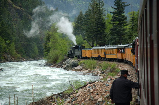 Um viertel nach acht geht unsere Fahrt unter lautem "gehorne" los. Überall stehen Menschen an den Schienen und winken uns zu. Es ist jedes Mal ein Erlebnis Durango mit der dampfenden und schnaufenden Lokomotive zu verlassen. Die Fahrt führt uns genau in das Tal, das wir vorher mit unserem Camper abgefahren haben. Schade, dass der Zug nicht bei unserem Campingplatz hält, hätte uns einen Weg gespart. Doch was soll's. Wir geniessen den strahlenden Sonnenschein und die herrliche Landschaft, die an uns vorüberzieht.