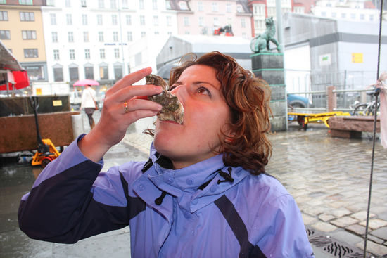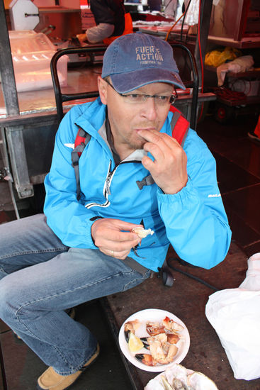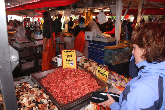 Nicht weit von Bryggen entfernt befindet sich der bekannte Fischmarkt. Die Preise sind zwar etwas höher als auf anderen Märkten, aber wenn man schon mal dort vorbeischaut, muss man schon etwas konsumieren. In unserem Fall waren es Austern und Krabben - lecker!!!!!!!