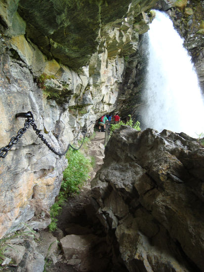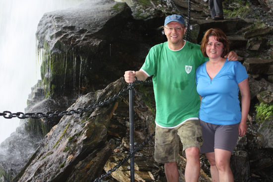 uns schwüle Wetterverhältnisse sind. Aber der Aufstieg lohnt sich. Erstens hat man die Möglichkeit, hinter den Wasserfall hineinzuklettern, und zweitens kann man sich danach bei dei Alm Veserås stärken.