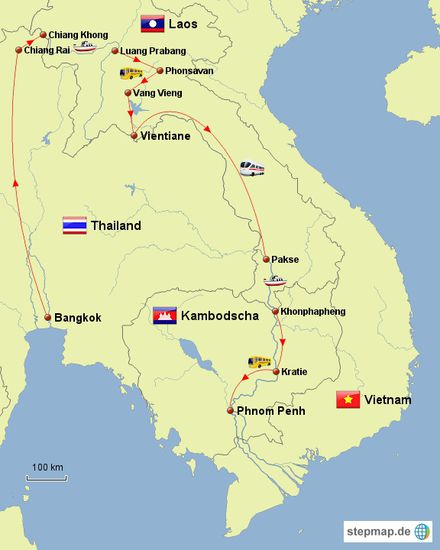 Dies ist unsere Reiseroute in Laos. Die Grenze zu Kambodscha liegt nahe bei Khonphaphong und ist für ausländische Touristen mit "Visa on Arrival" erst seit kurzer Zeit geöffnet. Das Grenzgebäude steht bereits, nicht aber die Strasse vom und zum Gebäude. Also fahren die Busse im Dreck (Regenzeit!) um das Gebäude herum, und zwar ohne Passagiere, damit der Bus etwas höher auf der Strasse liegt. Nach rund einer Stunde heisst es wieder in den Bus und weiter geht die Reise.