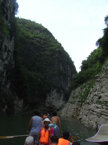 Nach einer Stunde Fahrzeit mussten wir abermals umsteigen, diesmal in kleine Holzboote. Starke chinesische Männer ruderten uns durch die beeindruckende Passage. Dieser Ausflug war wirklich genial, da man so nah an den Felsen und dem Wasser war, so dass die Schlucht (obwohl es nur eine kleine war) noch viel imposanter wirkte. Auf dem Rückweg sang unsere Führerin noch ein paar schöne chinesische Volkslieder und anschließend durften wir Wessis auch unser musisches Talent unter Beweis stellen und ein englischen Lied singen (you are my sunshine).