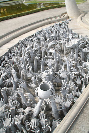 Er war unüblicherweise komplett weiß und verinnerlichte eine Szenerie, die wir so noch nie gesehen hatten und welche uns total in ihren Bann zog. Ein berühmter Künstler gestaltete die Wände im Inneren des Wats auf eine Weise, die den Buddhismus mit der Moderne kombinierte - ja schon fast symbiosemäßig vereinte. Auf der einen Seite stand das Böse, das Schlechte der Hölle und der Welt, in der wir leben. So tauchten Atomraketen neben Coca-Cola- Dosen auf und ein Vulkan ergoss seine Lava auf die Skyline einer Großstadt usw., usw.!