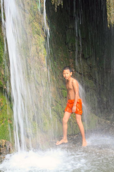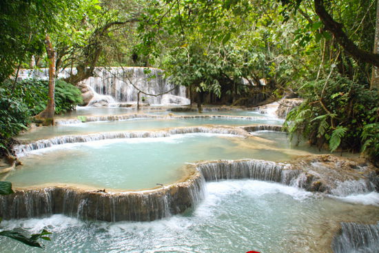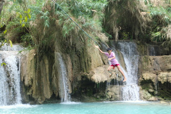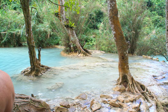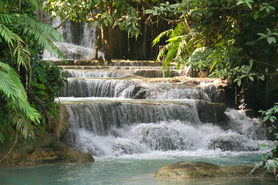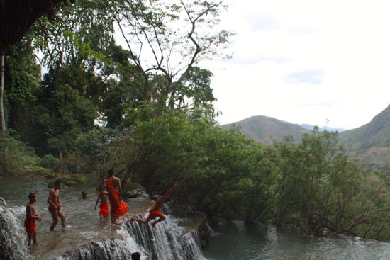 Den Tag begannen wir heute mit einem unterdurchschnittlichen Frühstück- aber tollem Ausblick auf den Mekong. Dann warteten wir auf den Minibus, der uns zum Wasserfall Tad Kuang Xi bringen sollte. Dieser verspätete sich um eine halbe Stunde (völlig normal in Laos) und zuckelte dann widerlich behäbig zum 25 km entfernten Ziel. Übrigens quetschten sich 13 Leute in die Karre, was den Trip nicht gerade spaßig werden ließ. Der Wasserfall entschädigte dann aber doch für alles. Über diverse Ebenen ergoss sich das Wasser in türkisblaue Becken - und das mitten im Urwald...eine Bilderbuchlandschaft...!