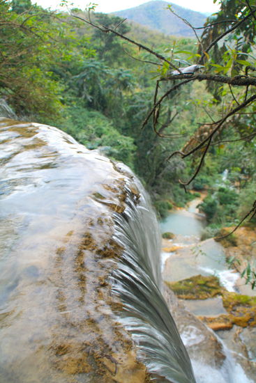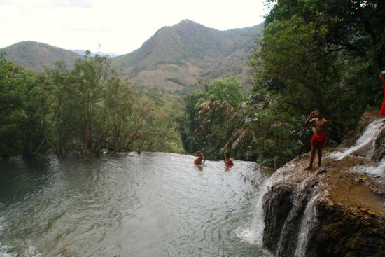 Oben angekommen ging es dann aber erst richtig hoch. Auf einem extrem steilen und lehmigen Pfad durch den Dschungel an der Seite des Wasserfalls berghoch führte uns der Weg zu weiteren, oberhalb liegenden Becken. Zum Schluss mussten wir direkt durch das herab fallende Wasser auf den überspülten Steinen empor klettern, um ans Ziel zu kommen. Dieser unwirkliche Pfad war es aber wert, von uns erklettert zu werden, denn oben angekommen entfaltete sich vor uns ein Anblick der Superlative,