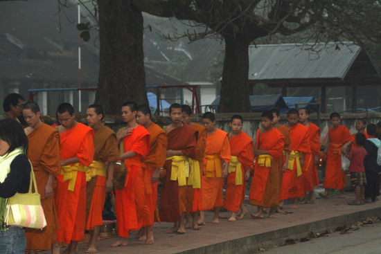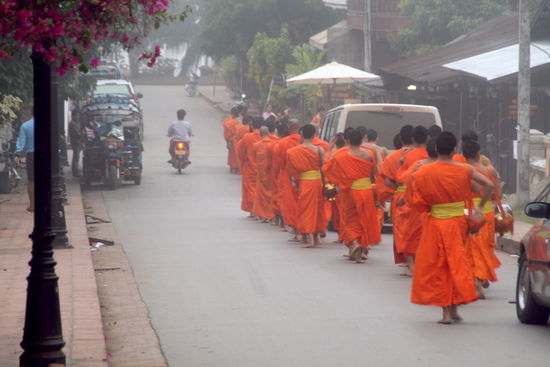 Ca. 300 barfüßige, orangene Kutten kamen im Morgennebel die Straße runter und erhielten von gläubigen Einheimischen, unter denen sich auch gläubig gebende Touristen mischten, diverse Nahrungsmittel - aber hauptsächlich Reis. Die Mönche wiederum gaben einen kleinen Teil bettelnden Waisenkindern weiter. Ein tolles Bild, welches auch diverse Postkarten schmückte.
