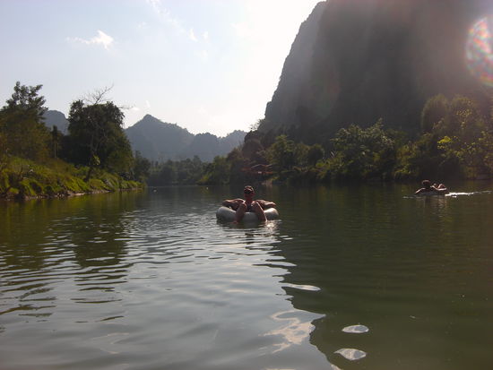 Heute Morgen haben wir nicht schlecht gestaunt, als uns der Rezeptionist mitteilte, dass wir nun ausziehen mögen, da das Zimmer reserviert ist. Ich protestierte erst vehement, aber nach einer kurzen Rechnung ging uns das Licht auf, dass wir ja schon 4 Tage hier sind...! Also Sachen packen, auschecken und was Neues suchen. Das ging aber schnell - einmal über die Straße, Zimmer angeschaut, eingecheckt und der Tag konnte beginnen. Wir entspannten noch etwas in einer Bar und stellten uns um halb zwei an die Schlange vorm Tubingbüro. Rasch hatten wir einen Reifen unter dem Arm und eine "Teilnehmernummer" auf den Arm gekritzelt bekommen. Wir wurden dann mit einem Pickup 4 km hinter Vang Vieng gefahren und ins Partyvolk abgeladen. Eine riesige Bretterbudenbar mit Tarzanschwingturm und heftig lauter Musik versetzten uns erstmal einen Kulturschock. Dann aber rein mit dem Arsch in den Trekkerreifen und in den Fluss. Keine 2 Minuten später schoss plötzlich eine Plastikflasche an meinem Kopf vorbei. An dieser war ein Seil befestigt - die "Touri - Angel", der nächsten Barbesitzer, die einen damit rausfischen wollten. Wir hätten nur festhalten müssen, und eine Stunde später wären wir hart oder breit...! Wir wollten aber erstmal das Ambiente genießen mit den sich aneinanderreihenden Bars, Schwingtürmen (inkl. der daran baumelnden Betrunkenen) und der hammerlauten Musik. An einer Bude wurden abwechselnd Schilder hochgehalten...Beer ? Whiskey ? Smoke ? Mushrooms ? Es war also für Jeden was dabei...! Wir hielten dann doch irgendwann an, weil es hier auch eine große Wasserrutsche gab, und das ist ja was für mich...! Aber erstmal gab's ein Bierchen für den Mut und ein paar Pigmente für die Haut. Dann kletterte ich auf den Turm mit dem Seil, schnappte mir dasselbige, und mit einem weithin hörbaren "Ahhhhhh...!" sauste ich über das Wasser hinweg und ließ mich irgendwann aus ca. 10 Metern fallen - total geil...! Grinsend stand ich wenig später wieder vor Sandra, und dann "musste" sie ja schließlich auch ran. Oben am Absprung brauchte sie zwar etwas "Bedenkzeit", aber dann faste sie sich ein Herz, und mit einem bis nach Vang Vieng hörbaren "Ahhhhhh...!" hatte auch sie ihren Spaß. Danach war die Wasserrutsche dran. Mit einer Absprunghöhe von guten 8 Metern machte ich einen ordentlichen Satz und fiel wie ein Sack Reis in den Fluss. Leider klemmte ich mir dabei einen Nerv im Nackenbereich ein, so dass ich die nächsten Tage wohl nach Tigerbalsam riechen werde. Der Rest der Tubingfahrt war dann sehr entspannt, die Partyburgen hörten auf und wir trieben durch tolle Berglandschaften und an einsamen Hütten vorbei...traumhaft.