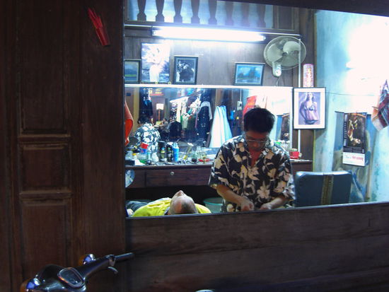 Der "Salon" des Barbiers war zur Straße hin offen, so dass auch alle Vorbeigehenden am Schauspiel - teilweise amüsiert, teilweise betroffen - teilhaben durften. Das "Werkzeug" hatte er wohl von seinem Opa geerbt...auf alle Fälle sahen der Kamm und die Schere so aus, als wären sie aus einem Stück gefeilt worden...! Dann ging es auch schon los - schnipp, schnapp, schnipp, schnapp - und schon lag die Wolle auf dem Boden, und ich sah aus wie ein Pole...! Dann schnibbelte er noch ein paar mal mit so einem Handmähgerät nach, und danach sah es doch ganz passabel aus - wenn auch sehr, sehr kurz - vor Allem vorne...jetzt kann ich gar nicht mehr meine Geheimratsecken verstecken...! Ich wollte schon aufstehen, da klappte der Stuhl zu einer Liege auf und ich lag auf dem Rücken. Mit dem von einer Ziege angefressenen Rasierpinsel wurde ich eingeseift, er spannte eine neue Klinge ein und schabte fleißig in meinem Gesicht rum. Ich wurde noch nie rasiert und so lange schon mal gar nicht. Aber das Ergebnis konnte sich sehen lassen. Dann war es aber immer noch nicht vorbei. Er schnallte sich eine Stirnlampe auf, und mit einem langen dünnen Schaber wurden meine Ohrhaare entfernt - bis ganz nach hinten...bei dieser Prozedur hörte ich komplett auf, zu atmen...! Dann klappte der Stuhl wieder zusammen, aber er war immer noch nicht fertig. Mit einem Gerät, das aussah wie eine Mischung aus Bandschleifer und Transformator wurde mein Kopf, Nacken und Rücken massiert bzw. durchgerüttelt. Dann war aber endlich Schluss und ich um eine einmalige Erfahrung reicher !