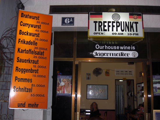 Auf dem Weg "nach Hause" suchten und fanden wir noch das Travelerbüro der "T.M. Brothers". Hier buchten wir die Weiterreise nach Mui Ne am Dienstag, und weil es angeboten wurde, das Hotel dort gleich mit. Wir werden mit einem Sleepybus (Schlafsitze) vom Hotel abgeholt und dort am Hotel rausgelassen - absolut genial...! Die Weiterfahrt nach Saigon ist auch nur noch Formsache, so dass die Reise bis Phnom Penh durchgebucht ist. Abends wollten wir mal wieder zum Thailänder (...) essen gehen. Den fanden wir zwar nicht, aber irgendwann las ich aus dem Augenwinkel das Wort "Sauerkraut"!