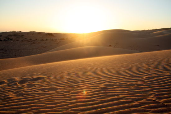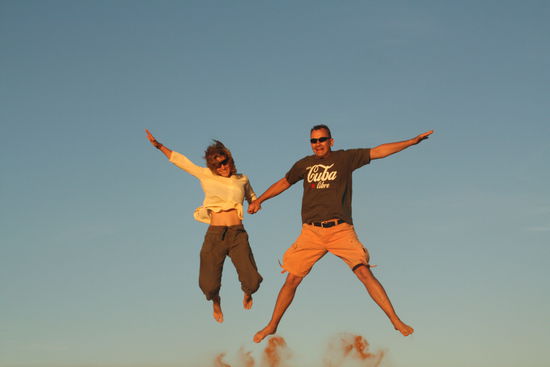 Nachdem wir mit der Plaste unterm Arsch die Dünen runtergesaust sind, genossen wir die Szenerie mit dem leichten Wind, der Wellen in den Sand schrieb und die roten Sandkörner wie zarten Rauch über die Dünenkanten stob...dazu der Sonnenuntergang, der fantastische Gelb-, Orange- und Rot- Töne hervorzauberte...mehr geht nicht...!