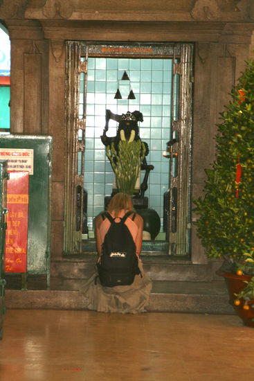 Mit Räucherstäbchen in der Hand lief man um den Altar und steckte je 2 Stäbchen in mit Sand gefüllte Schalen. Dann noch einmal abknien, und schon steht unserer Familienplanung nichts mehr im Wege...! Einen kleinen negativen Touch hatte die Sache noch, als die Stäbchenverkäufer plötzlich 200000 Dong haben wollten. Das ist mal schnell das 10- fache des normalen Preises. Nun - mehr als 60.000 hat sie von uns nicht bekommen - die alte Zippe...und was haben wir wieder einmal gelernt ? Erst den Preis aushandeln ! Auf dem Rückweg zum Hotel sahen wir eine besonders schön geschmückte Straße, was wir uns für den Abend merkten.