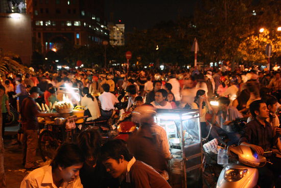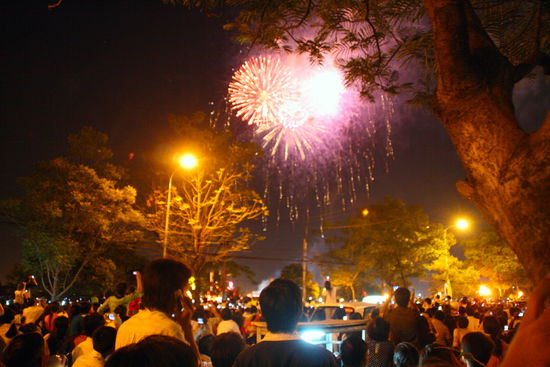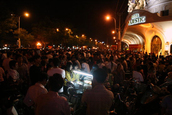 Um auf die andere Seite zu kommen, brauchten wir tatsächlich eine gute viertel Stunde. Wir ließen uns dann in der Nähe des Majestic- Hotels nieder und warteten mit halb Saigon auf Mitternacht. Punkt 00:00 Uhr gab es dann ein tolles 15- minütiges Feuerwerk, welches von der Menschenmasse frenetisch bejubelt wurde, und bei einer gefühlten Million Zuschauer hört sich das schon ziemlich fantastisch an...!