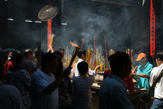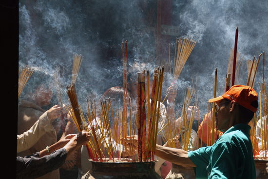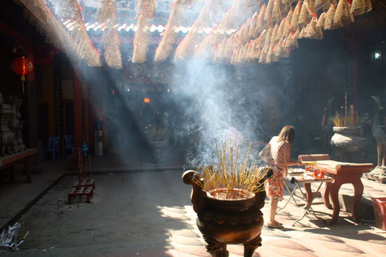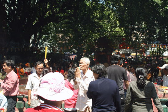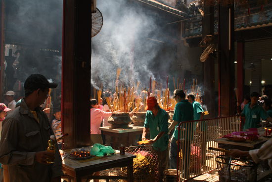 Wir ließen uns mit dem Strom hineintreiben und waren über die Menschenmassen nicht gerade hoch erfreut, welche sich Räucherstäbchen wedelnd und dicht an dicht gedrängt durch die Räumlichkeiten der Pagode schoben. Dabei lag der beißende Nebel der Stäbchen in der Luft, der das Atmen schwer machte und unsere Augen brennen ließ - dazu kamen noch 35 Grad Lufttemperatur und kein Luftzug...!
