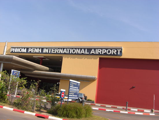 Das Taxi stand pünktlich vor der Tür und wenig später standen wir endlich im klimatisierten Flughafengebäude. Endlich u.a. auch deshalb, weil die 35 Grad warme und schwüle Luft langsam aber sicher erdrückte. Sandras Kreislauf bedankte sich herzlich und konnte wieder hochfahren. Kaum, dass der Flieger seine Flughöhe erreicht hatte, setzte er auch schon wieder zum Landeanflug an...! Kein Wunder bei einer Strecke von weniger als 200 km, aber dadurch ersparten wir uns wieder einmal 12 Stunden Busfahrt und jede Menge Stress und Schweiß. Um 15:30 Uhr standen wir mit neuem Visum vor dem Flughafen von Phnom Penh auf kambodschanischem Boden.