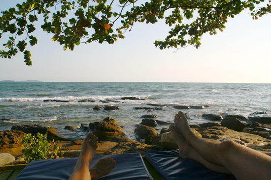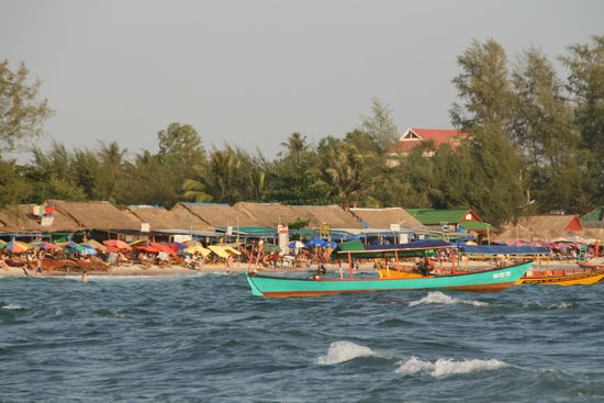 Wir beratschlagten kurz, wägten Vor- und Nachteile ab und kamen zum Schluss, dass die Vorteile überwiegen. Nach kurzer Verhandlung einigten wir uns auf akzeptable 50$ für eine 3,5 stündige Fahrt über 250 km. Bequemes und schnelles Reisen also - und dazu noch relativ bezahlbar. Relativ deshalb, weil eine Busfahrkarte wahrscheinlich nur 5 $ gekostet hätte, aber Zeit ist ja auch Geld...! Auf der Autofahrt redeten wir kaum, außer dass ich Sandra im Kurzraffer die Geschichte Kambodschas erzählte - inkl. der Roten Khmer- Vergangenheit, was uns beiden noch mal das grausame Schicksal des kambodschanischen Volkes vor Augen führte, was rein generationsbezogen auch das unsere hätte sein können...! Wir betrachteten also im Vorbeifahren die teilweise erschreckende Armut, sahen aber auch viele fröhliche und lachende Gesichter. Weniger fröhlich war unsere Ankunft in Sihanoukville, denn was wir nicht wussten, war, dass in Kambodscha gleichzeitig zu Vietnam das TET- Fest bzw. das "Happy New Year" gefeiert wird...! Kurzum - die Gasthäuser und Hotels - und davon gibt es hier haufenweise - waren alle restlos "full"! Sandra wartete beim Taxi, dessen Fahrer schon total genervt war, und ich durchkämmte straßenweise die Rezeptionen, wo ich immer die gleiche Antwort erhielt: "Full".