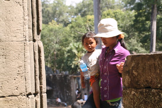 Komplett durchgeschwitzt und glücklich, da gewesen und durch die heiligen Ruinen gewandelt zu sein, ging es weiter zum Preah Khan. Vorher machten wir noch Rast, um uns zu stärken. Dabei zerfloss Sandra, wie Butter in der Sonne, als sie wirklich herzzerreißend von einem kleinen überaus niedlichen Mädchen um den Kauf von Armkettchen ersucht wurde...! "Madame...please...only 1 Dollar...3 for 1 Dollar...please...Madame...why not...Madame...please...!