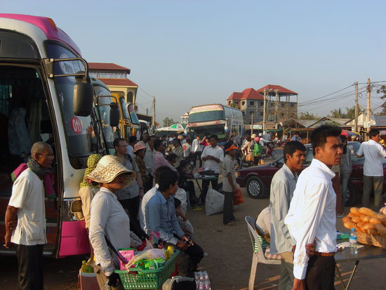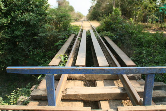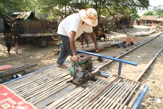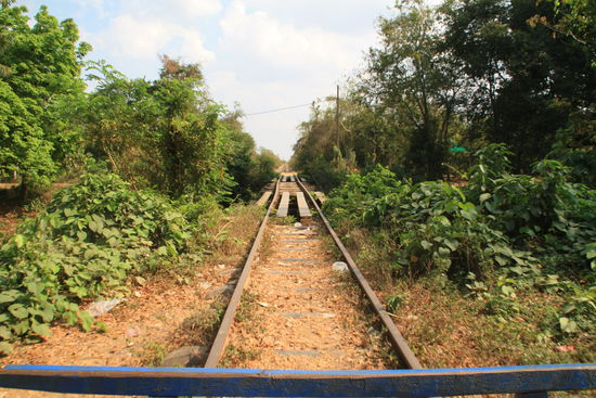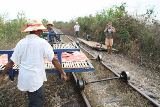 Der Tempel selbst war nicht so prall, also wieder bergab und schwitzen. Unten gönnten wir uns dann erst mal ein Süppchen zur Stärkung und Getränke zur Kühlung. Mit neuen Kräften ging die Fahrt weiter...wieder über die Staubpiste...zum Bahnhof...! Hier stiegen wir nicht in den Zug, sondern auf die Bambusbahn - einem Vehikel mit 2 mobilen abnehmbaren Achsen und einer 2 x 3 Meter großen Bambusplattform, die auf die Achsen gesetzt wird - per Hand. Angetrieben wird das Ganze mit einem kleinen Benzinmotor, der mit einem Keilriemen mit der einen Achse verbunden ist. O.k. - draufgesetzt und ab die Post - hui ging das schnell, und eh wir uns versahen, fuhren wir mit der Bambusbahn mitten im tiefsten Kambodscha vorbei an Reisfeldern, über kleine Brücken und auf krummen Schienen, die glaube ich noch aus der Kolonialzeit stammen.