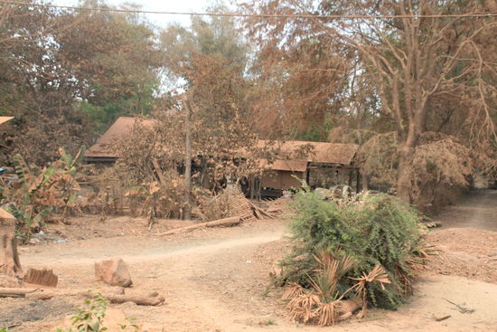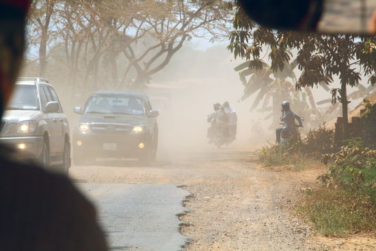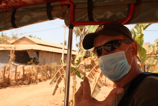 Dafür hatte aber jeder von uns eine Sitzbank für sich, und der Bus brauchte nur 3 Stunden bis Battambang. Einziger Wermutstropfen waren die 2 Italiener hinter uns, die die ganze Fahrt über laut quatschten...! Wir checkten dann im Hotel unserer Wahl ein - dem Royal - und wenig später saßen wir schon im TukTuk. Auf dem Weg zum Tempel - 15 km außerhalb - hielt der Fahrer kurz an, kaufte uns was zu trinken (...) und drückte uns 2 x Mundschutz in die Hand. 5 Minuten später wussten wir warum, denn dann wechselte der Straßenbelag von festem Schotter zu rötlich staubiger Piste...!